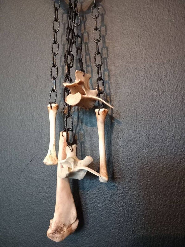 I split 2 lower jaws from the deer and then combined the 4 pieces to make this Nightmare Catcher. The centerpiece is a chamois horn with a black skull on it. Funnily enough, this reminded me of a worm, which is where the cool name of the Nightmare Catcher comes from! The black iron chains with the different bones on them give the whole thing a rough, edgy touch!
