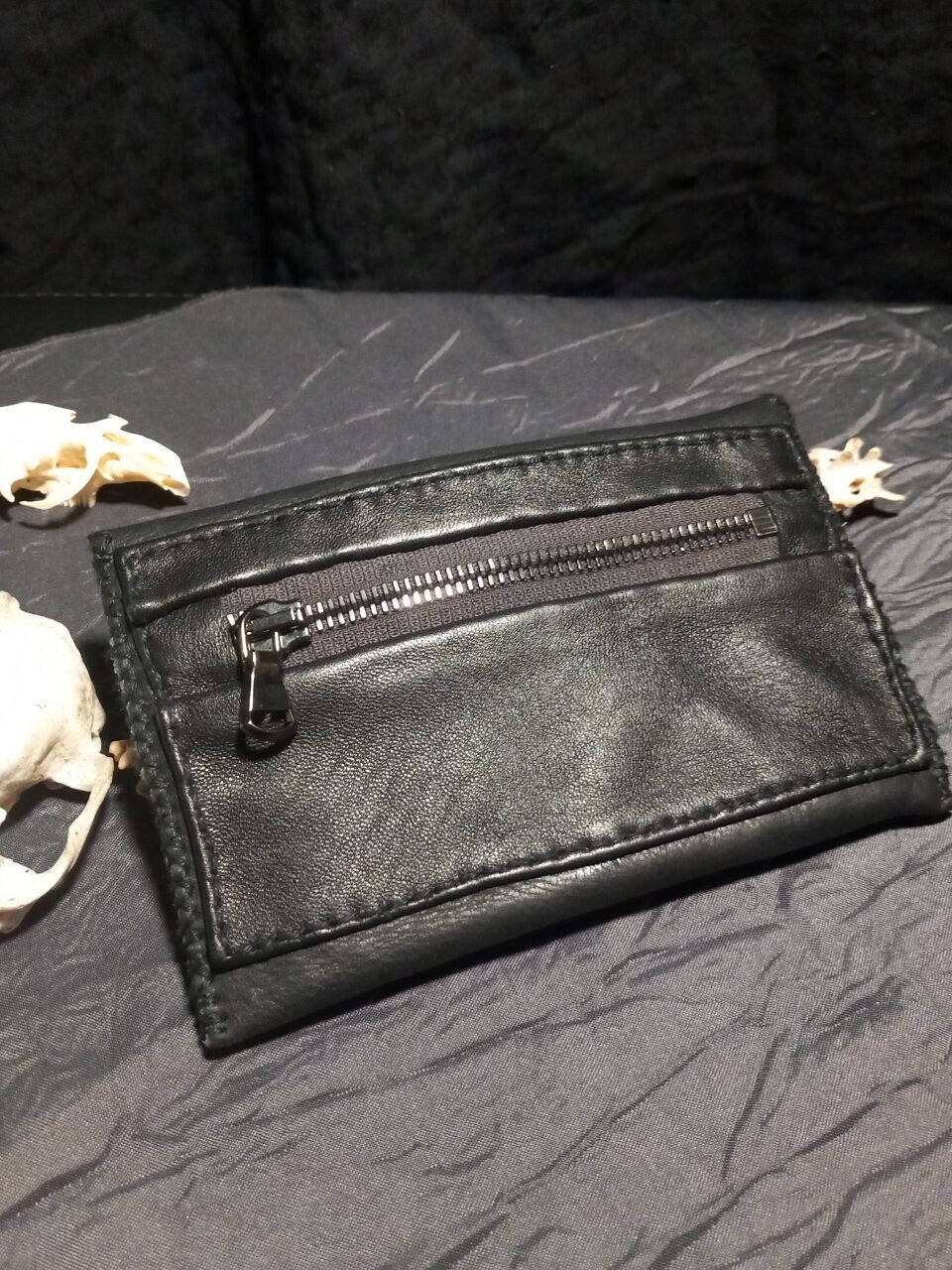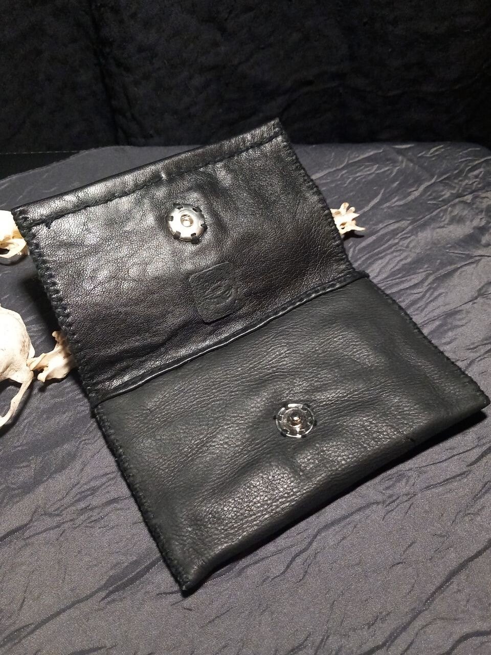 Beautiful soft leather purse with skull decoration I casted out of epoxy. You can close it with a press stud and there are 2 extra compartments inside for your cards. There is also an additional zippered compartment at the back to store your small change.