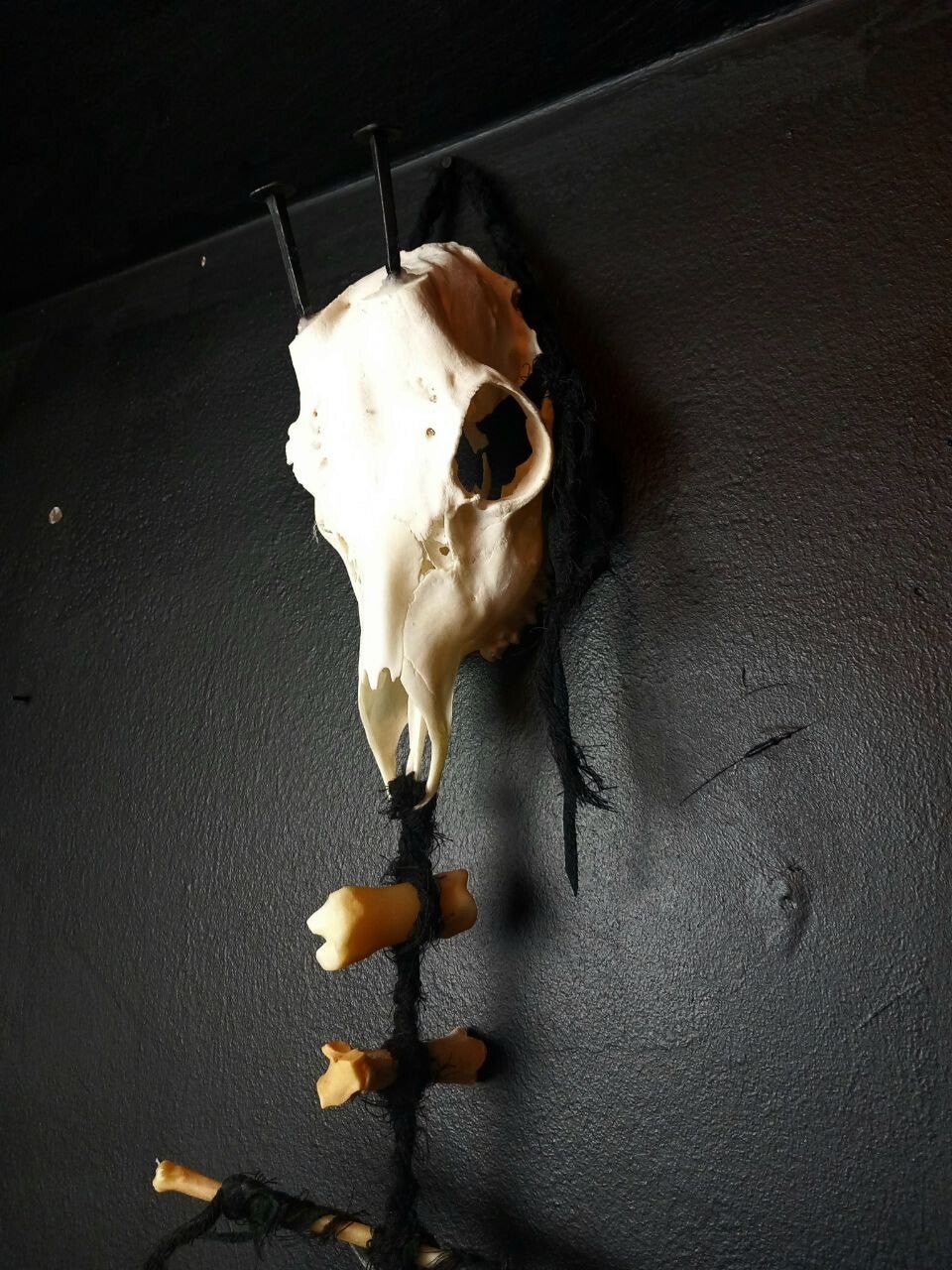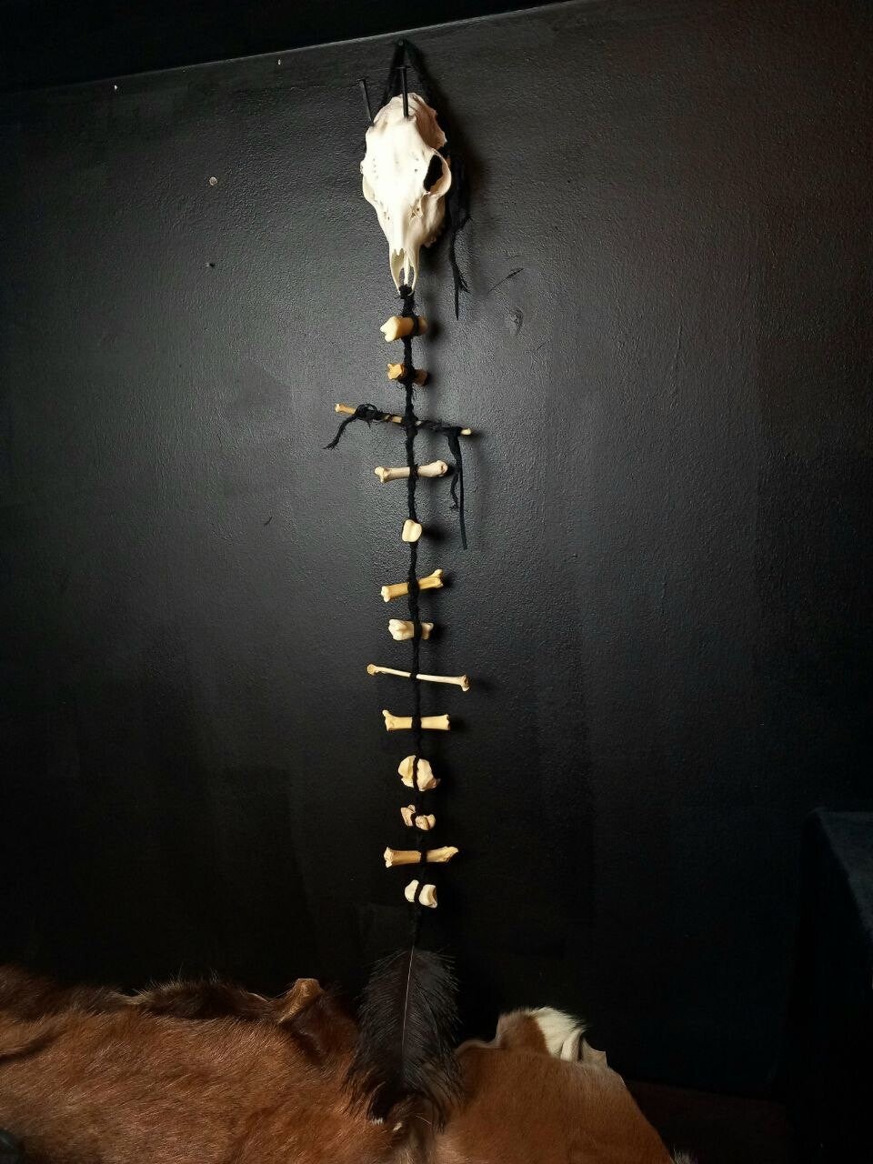 Ritual or decorative bone hanger with a beautiful deer skull including teeth at the top. I swapped the horns for two massive witches' coffin nails. Animal bones of different sizes and shapes form the chain at the bottom, which then ends with a large black ostrich feather.