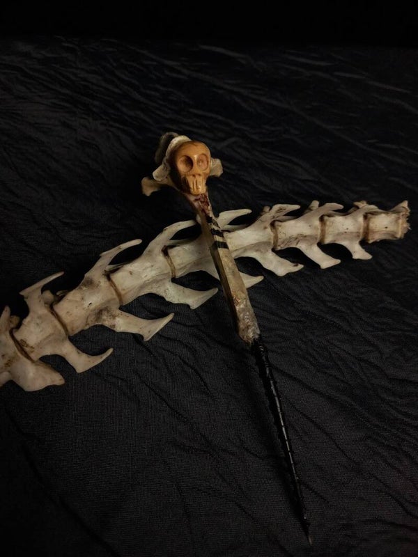 Witch needle made from animal bone and a porcupine quill decorated with a skull