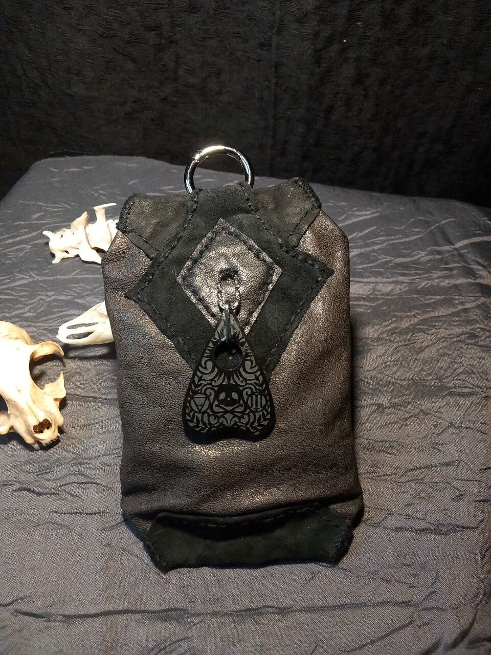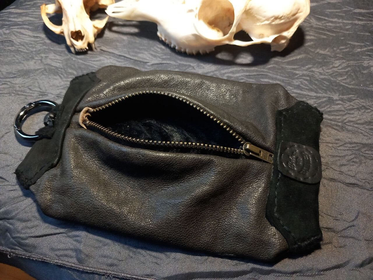 Practical, spacious zippered pouch that can be opened at the center back with a large zipper. I worked with different types of leather to create a beautiful interplay of dark shades. You can also easily hang it up anywhere using the round hook.