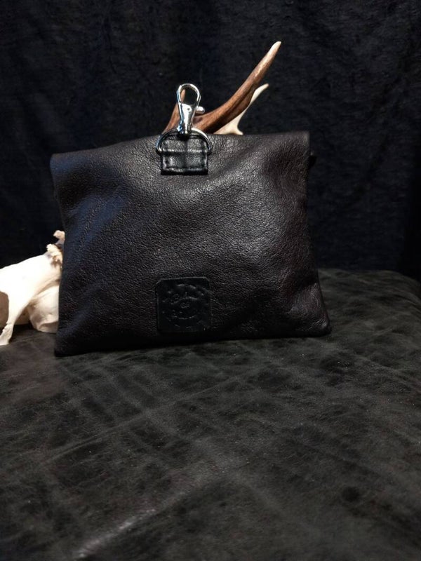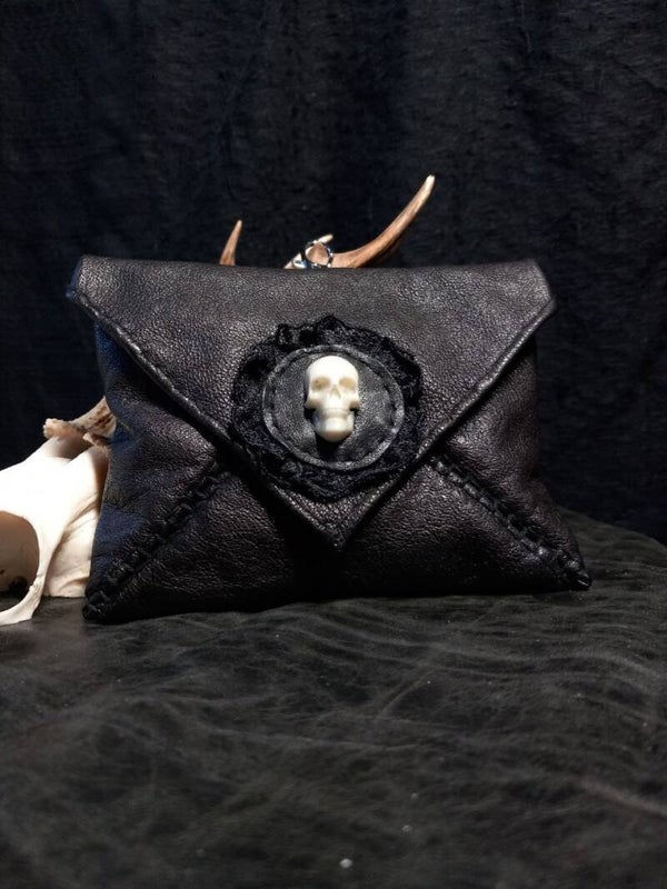 Small leather pouch in the shape of an envelope on a key ring. The skull decoration conceals a magnet, allowing the bag to be opened and closed easily and securely. There is beautiful lace fabric inside.