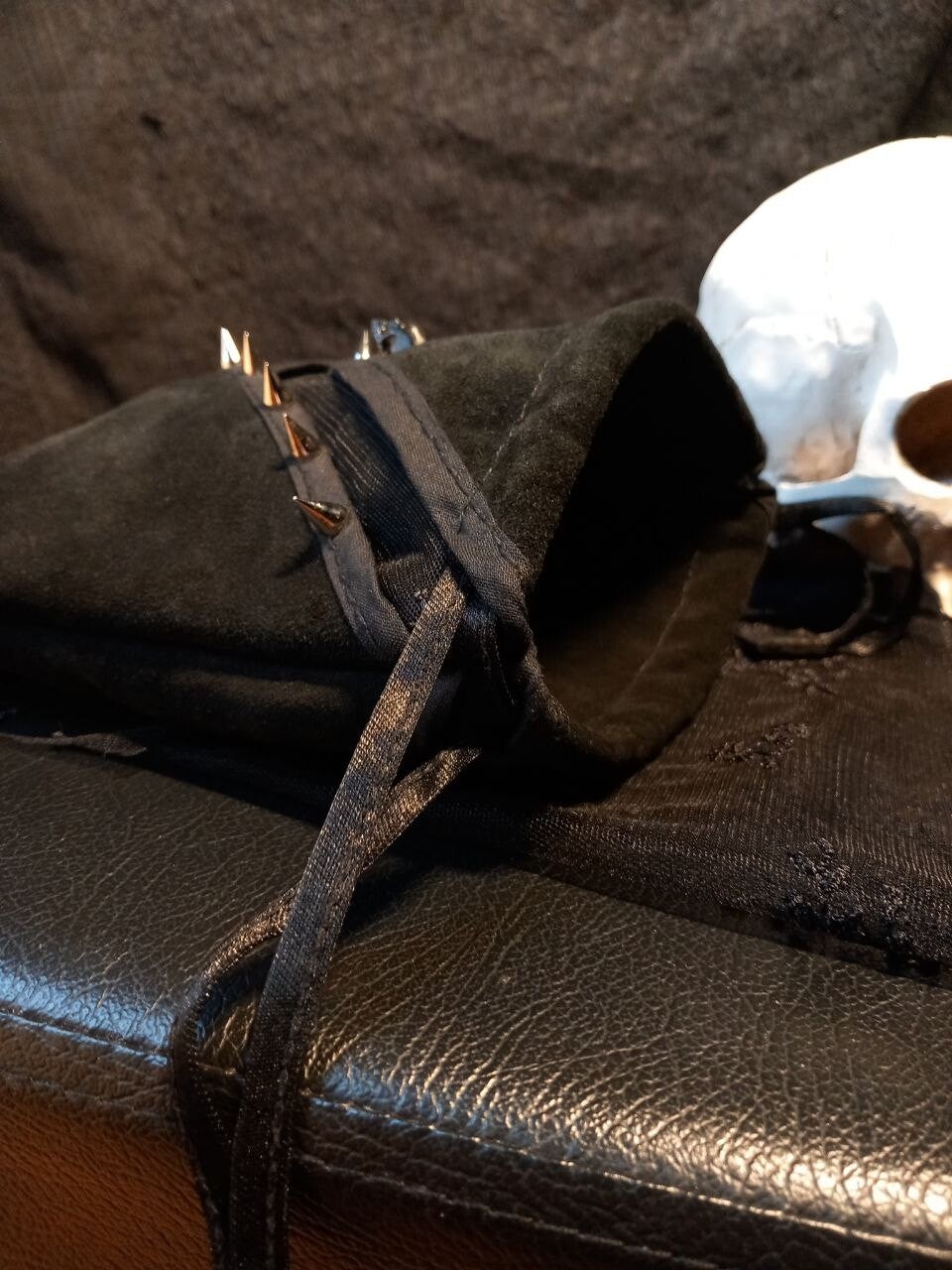Suede leather bag with drawstring. It looks identical at the front and back. Both outer compartments, which are decorated with spiky studs, are lined with beautiful lace fabric on the inside.