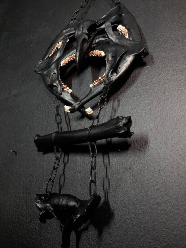 Four ower jaws of a deer give the bone hanger its shape and frame a raven skull, which was cast from epoxy. Further bones hang from the chains, including a deer femur and part of a pig's coccyx bone.