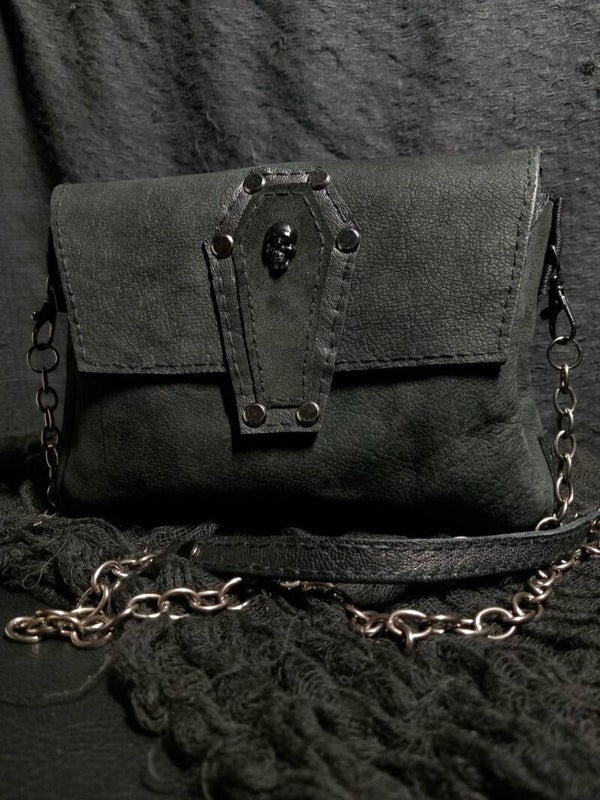 Shoulder bag with magnetic closure in the style of a coffin with skull decoration. The inside of the bag is lined with another layer of leather. There is also another zippered compartment. You can easily remove the shoulder strap using the two clips and convert the bag into a belt bag. There are two flat, inconspicuous belt loops at the back. These allow you to wear the bag with any belt.