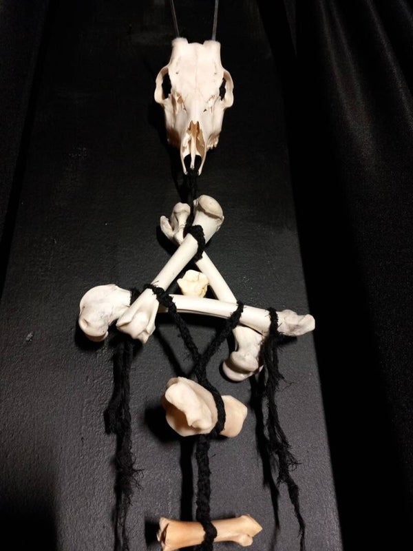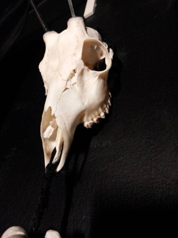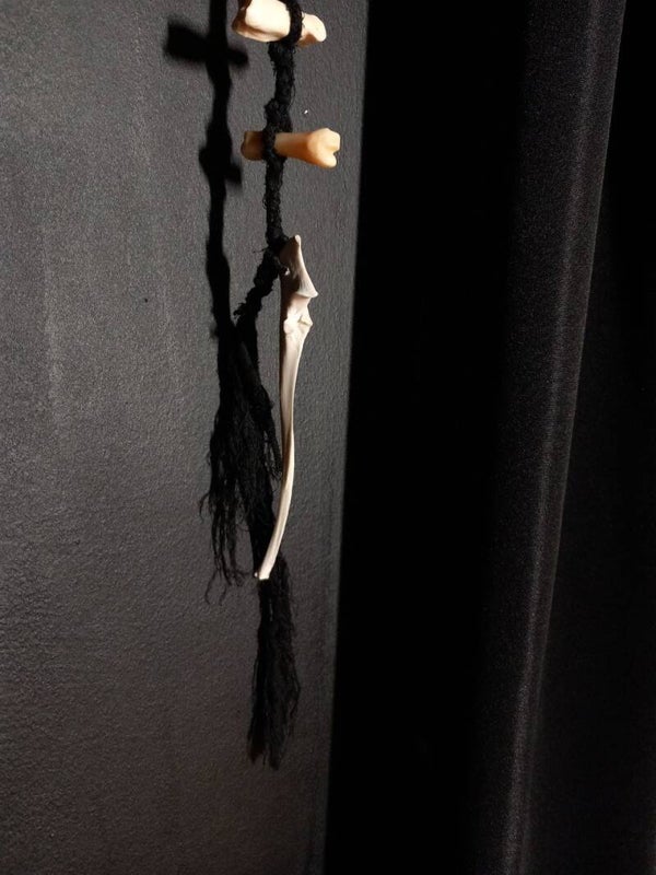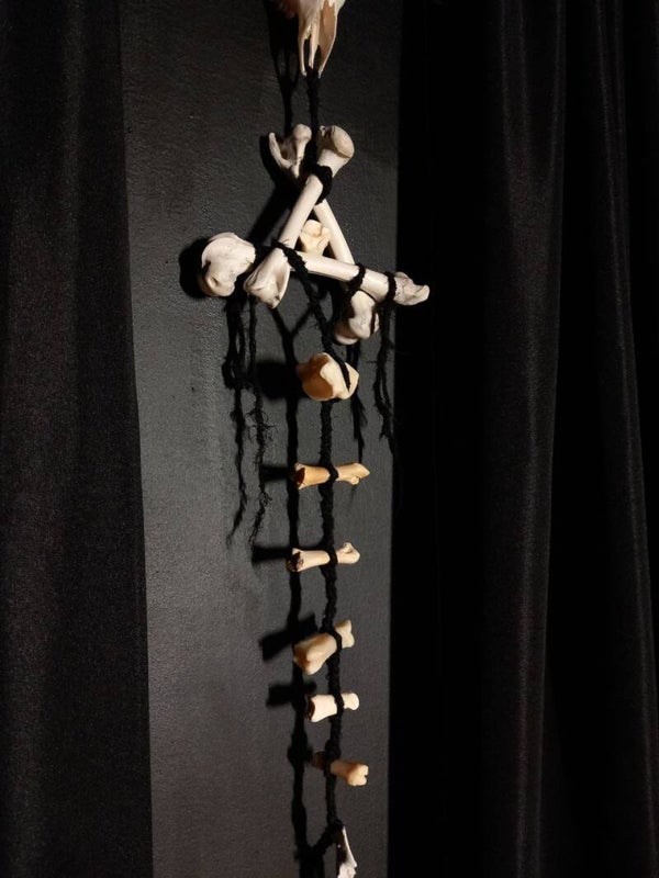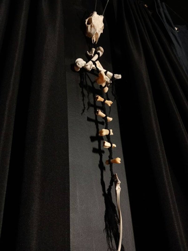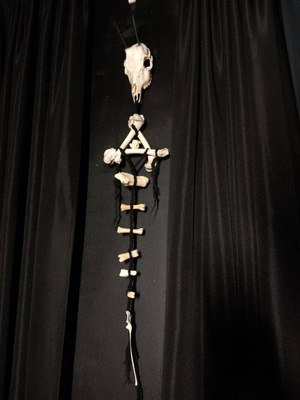 The head of this bone hanger is from a deer, whose horns I have replaced with long, coarse witch nails. The triangle is also formed by deer bones. Various other animal bones, which have all been linked and sewn together, complete this "bone snake".