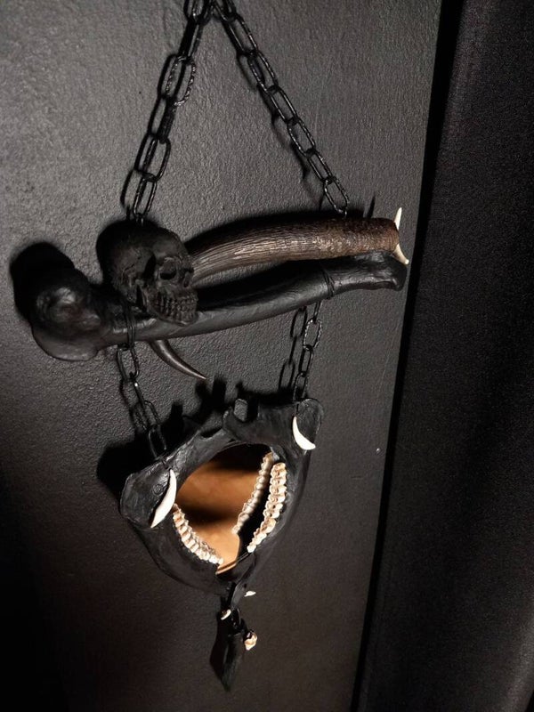 Wall decoration - a deer bone and a chamois horn holding a small mirror with black chains, which is framed by deer mandibles and decorated with fox teeth. The pointed end is a piece of deer antler with a deer tooth on it