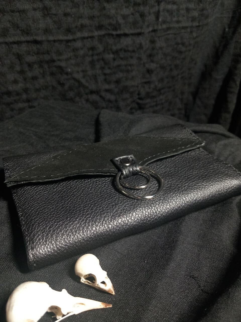 Tobacco pouch with magnetic closure and ring decorations made from a double layer of leather.
