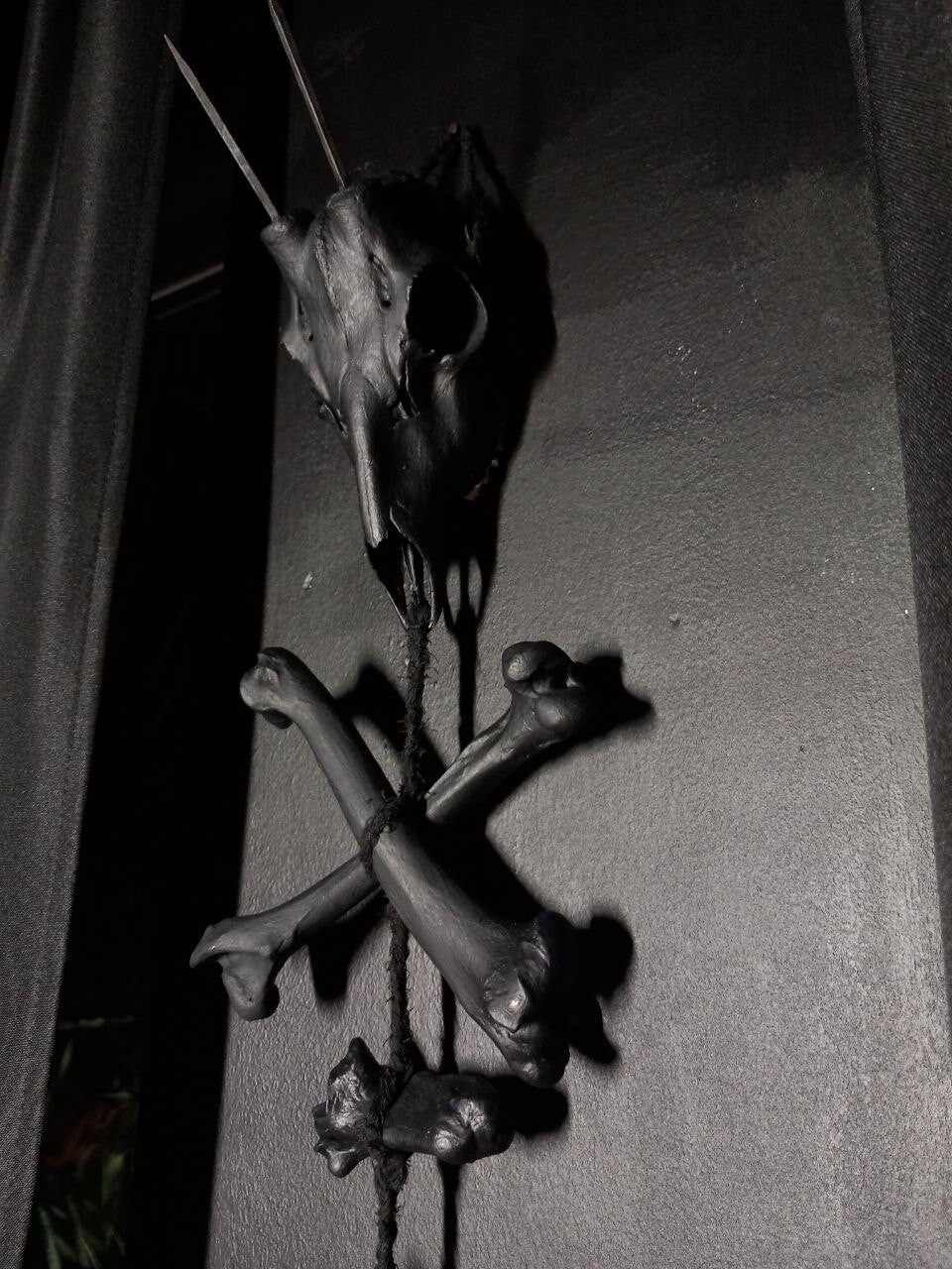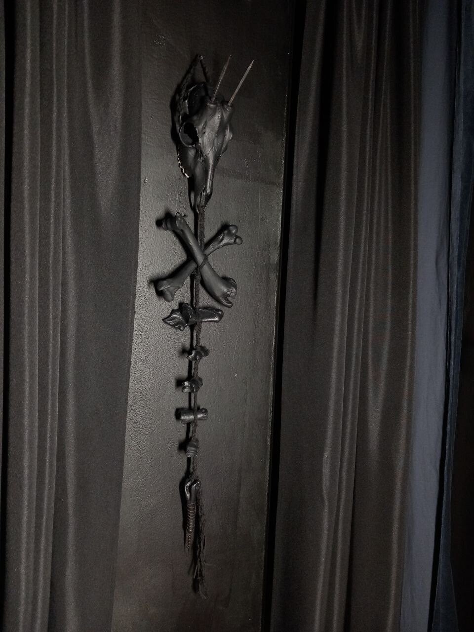 The head of this bone hanger is from a deer, whose horns I have replaced with long, coarse witch nails. The "X" is also formed by deer bones. Various other animal bones, which have all been linked and sewn together, complete this "bone snake". At the end you can find one of my witch needles, which is made from bone and a porcupine quill. Caution: very sharp!