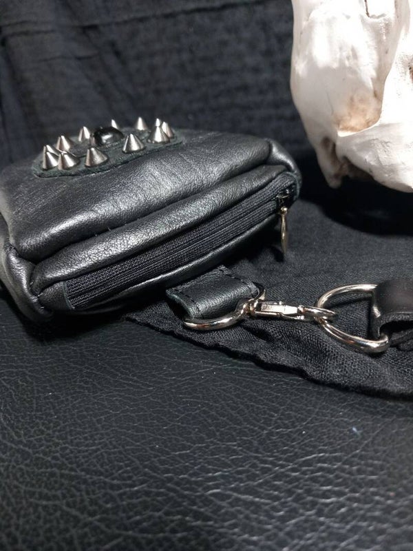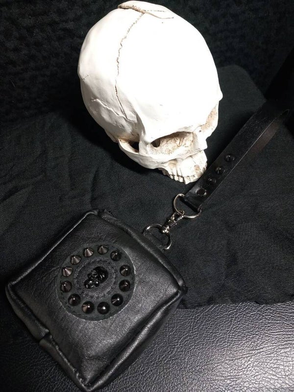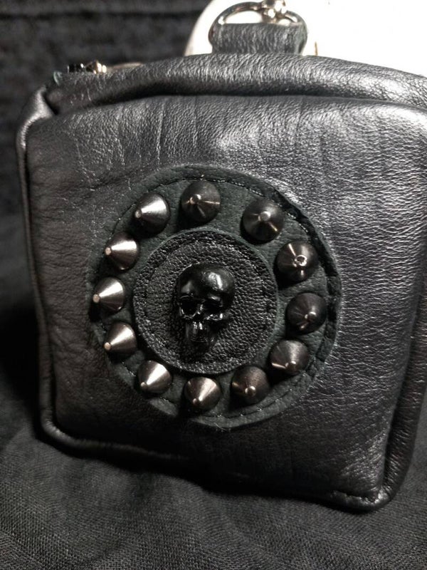 Small, square keychain bag made from two layers of leather with a skull and stud decoration.