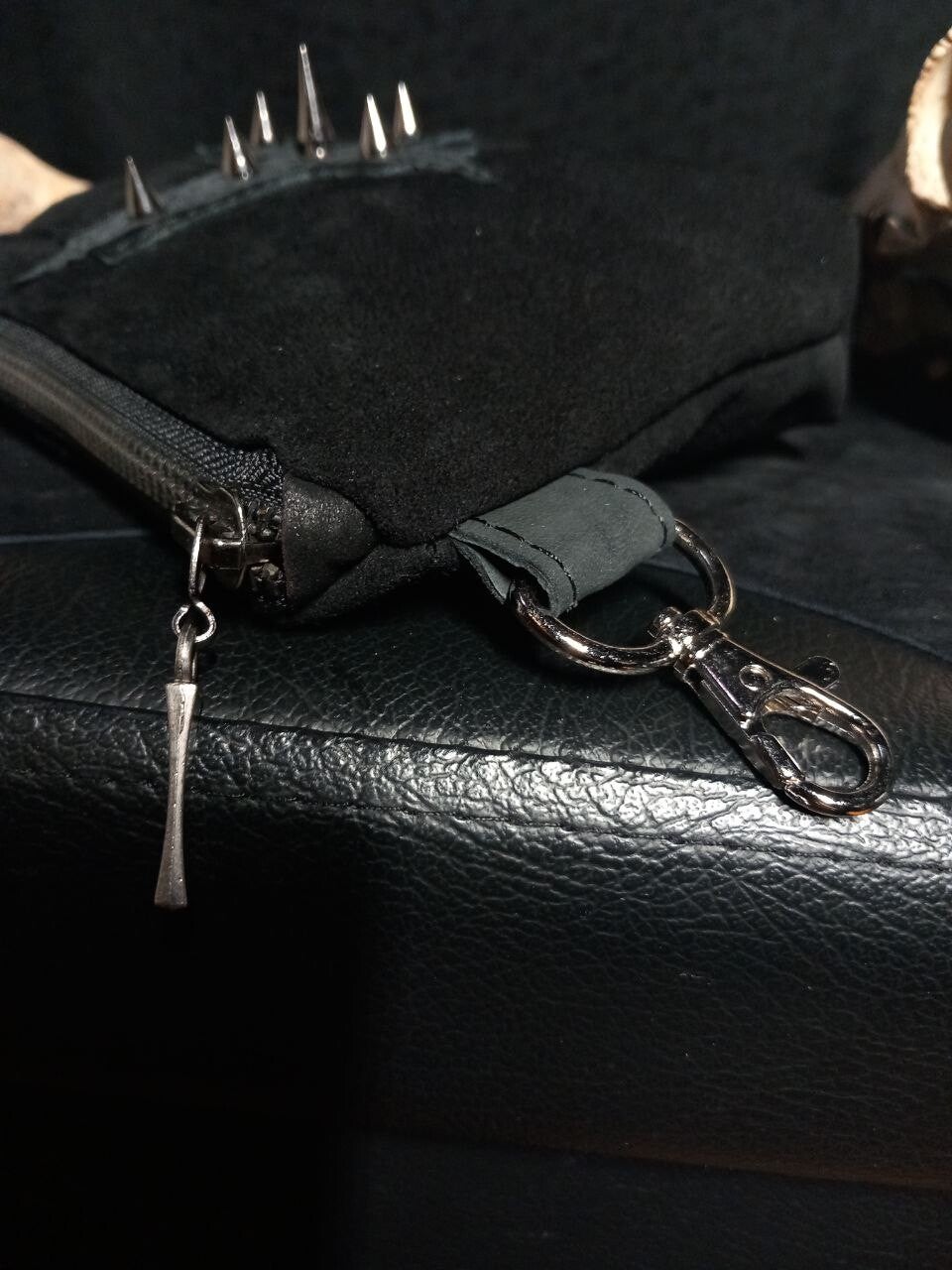 Hand-sewn zippered cosmetic bag made of suede with a cross, also made of leather, decorated with studs.