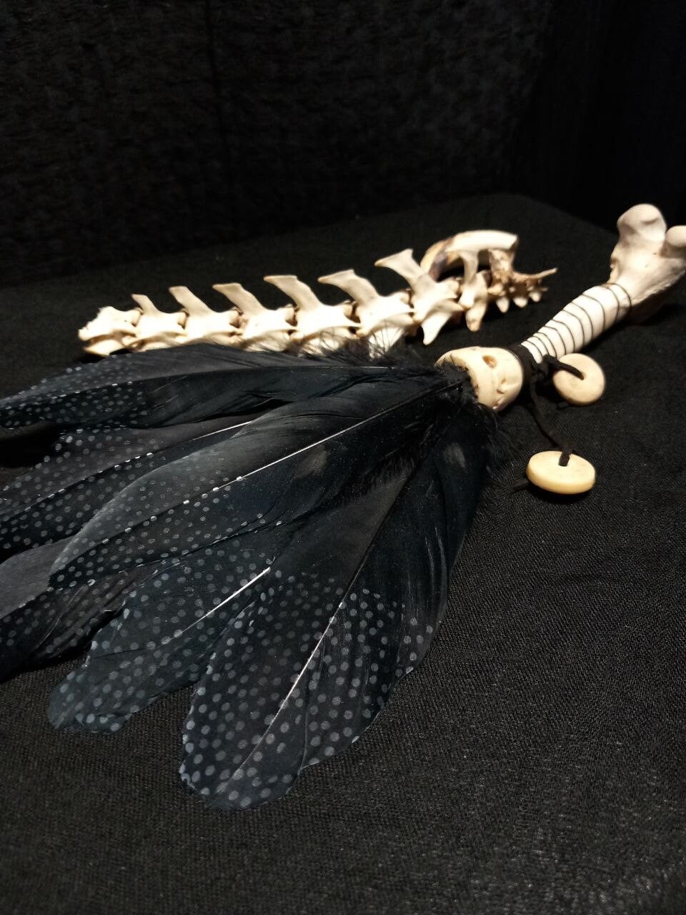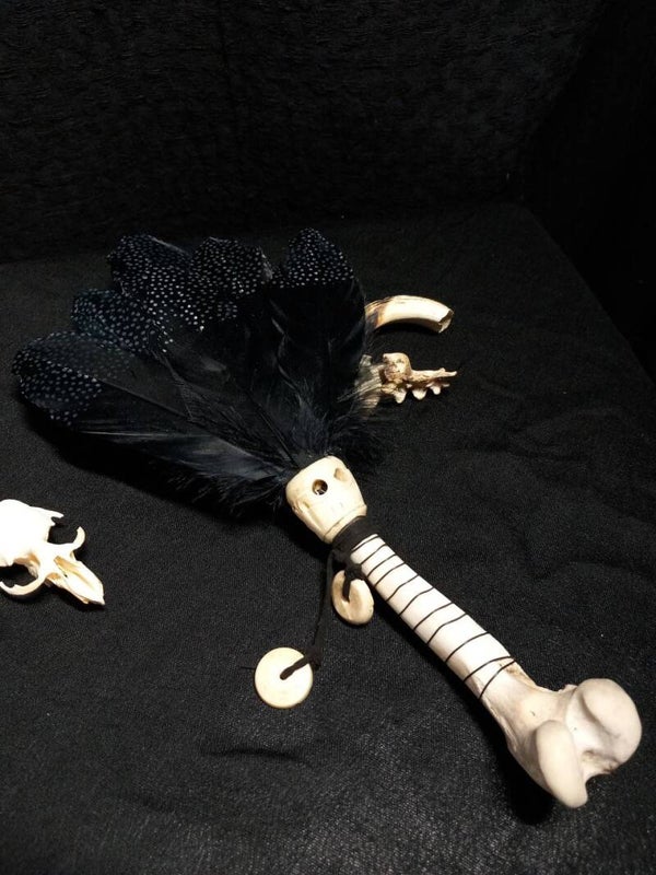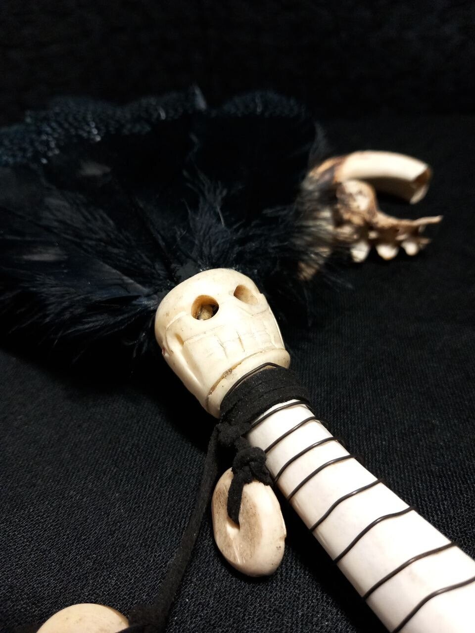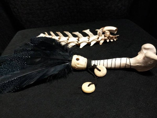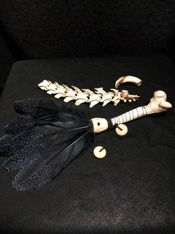 Incense fan made from deer bone and feathers. The small skull is also made of bone.