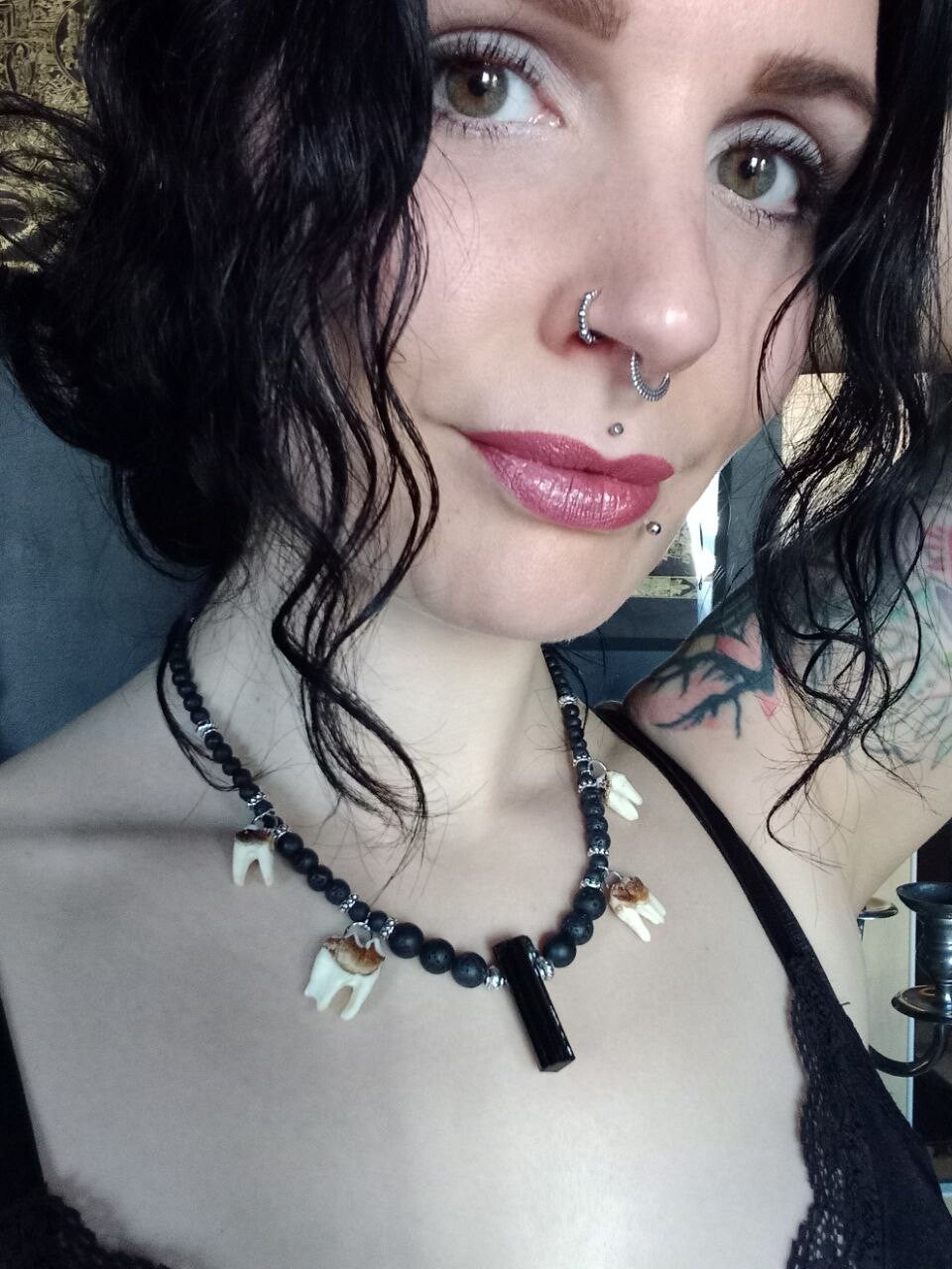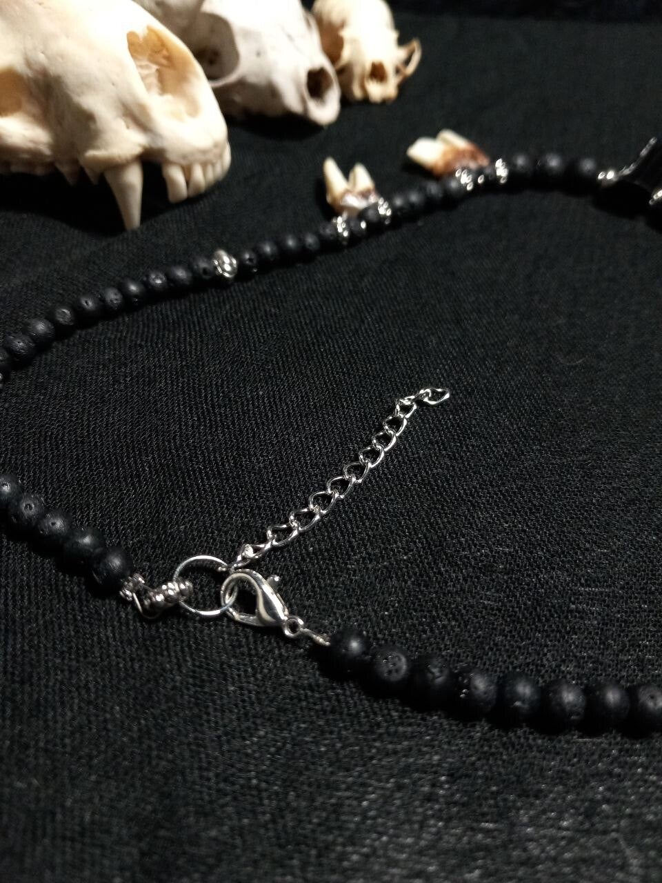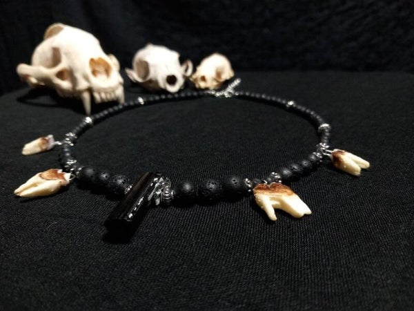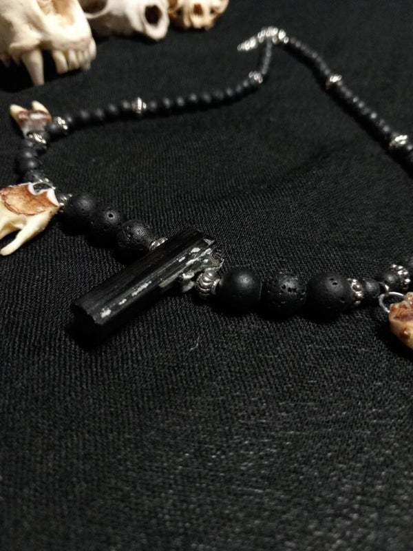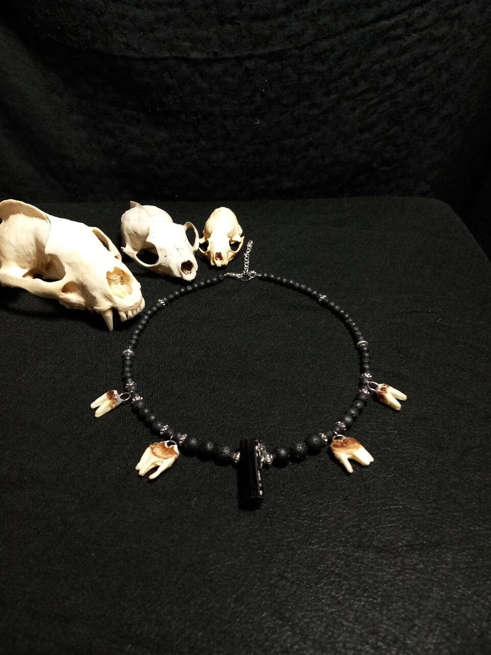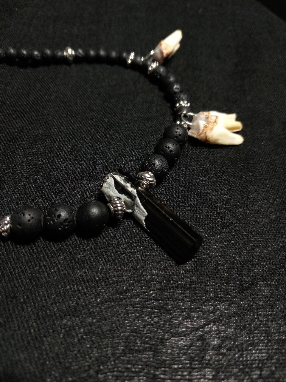The centerpiece of this lava stone necklace is a black tourmaline with a small amount of quartz crystal, surrounded by four beautiful deer teeth.The necklace is adjustable.