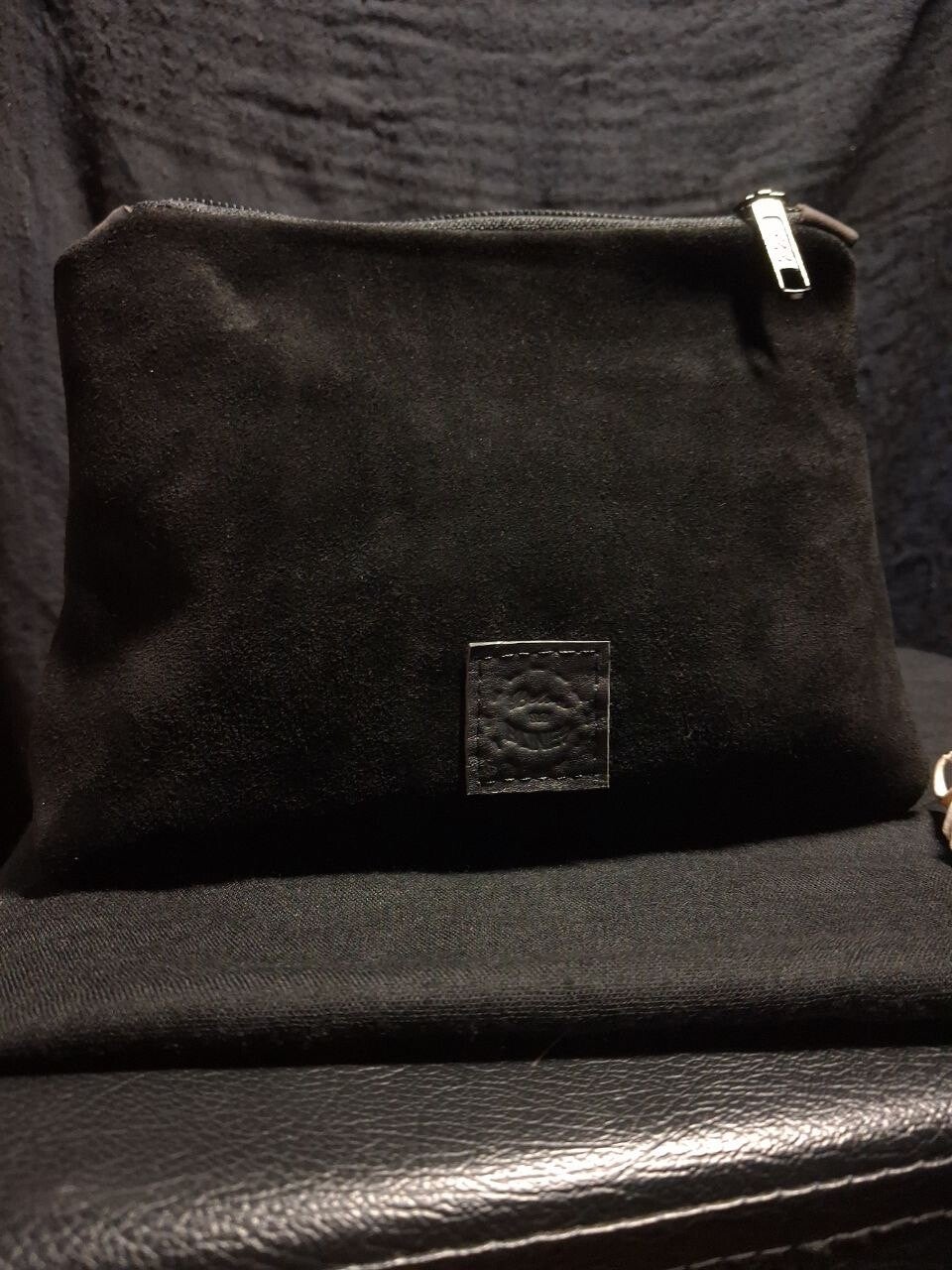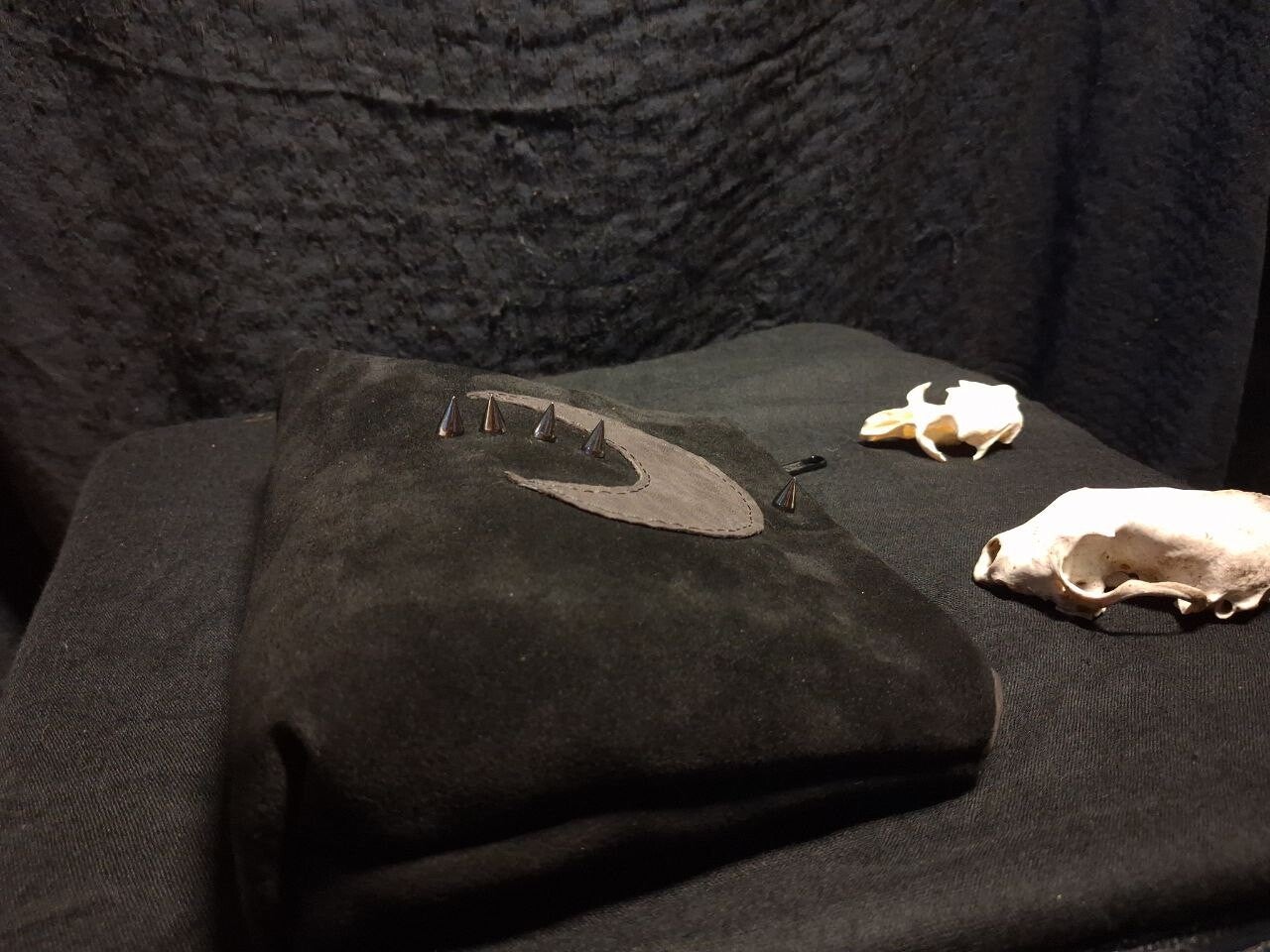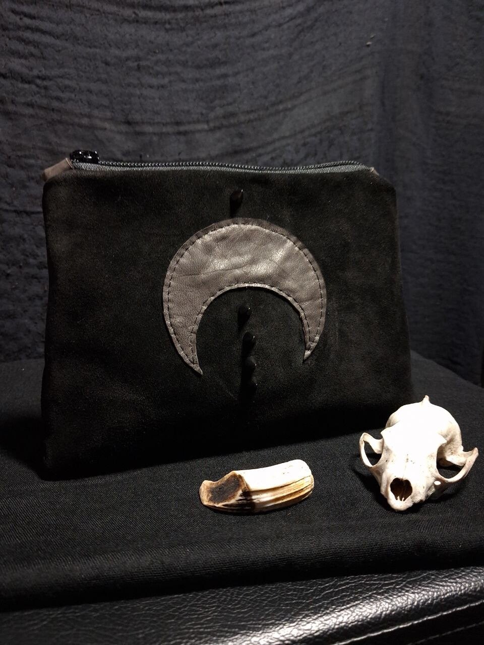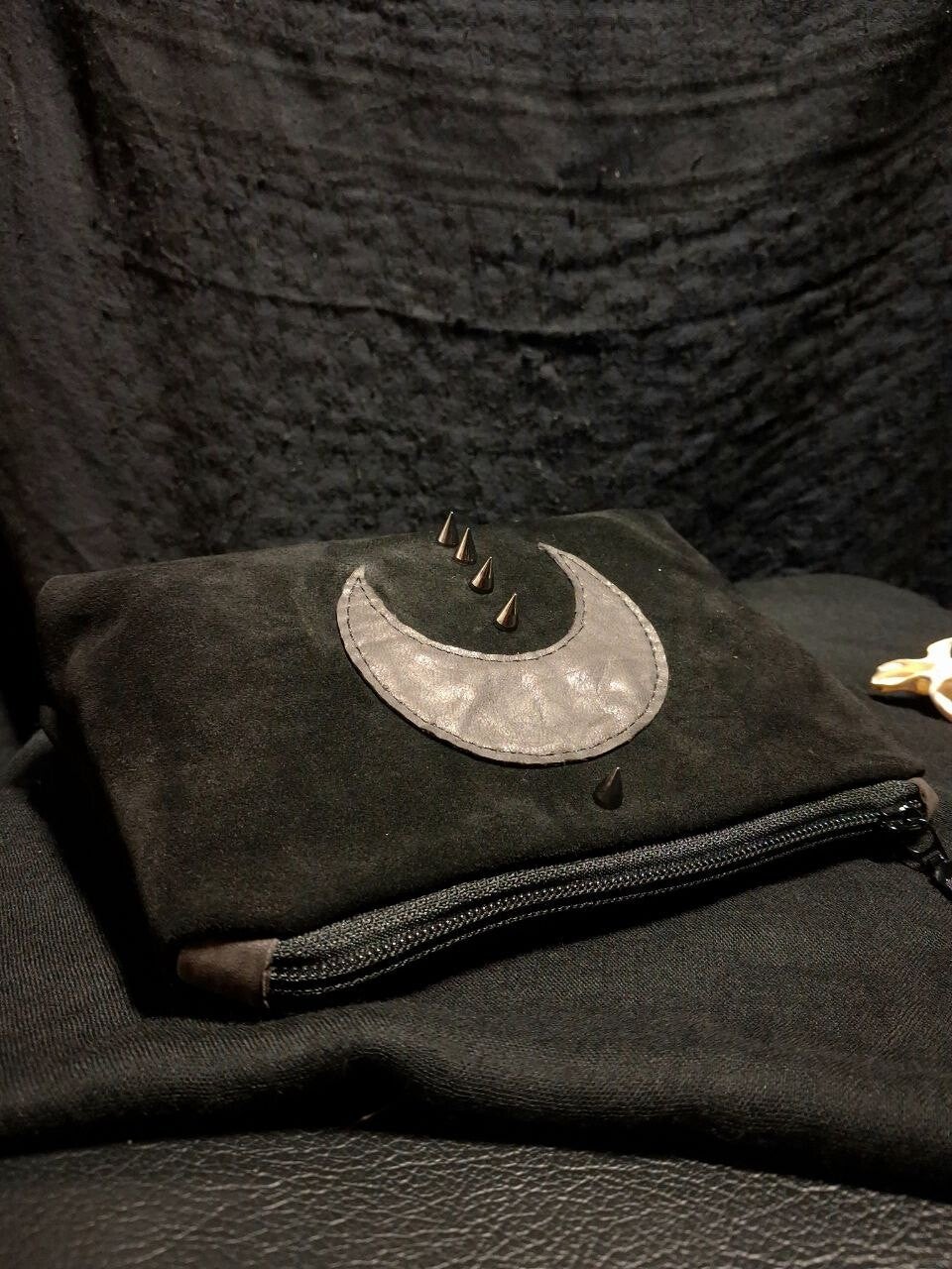 Cosmetic bag with moon and stud decoration. It is particularly robust as it is made of 2 layers of leather. Suede leather on the outside and beautiful soft leather on the inside.