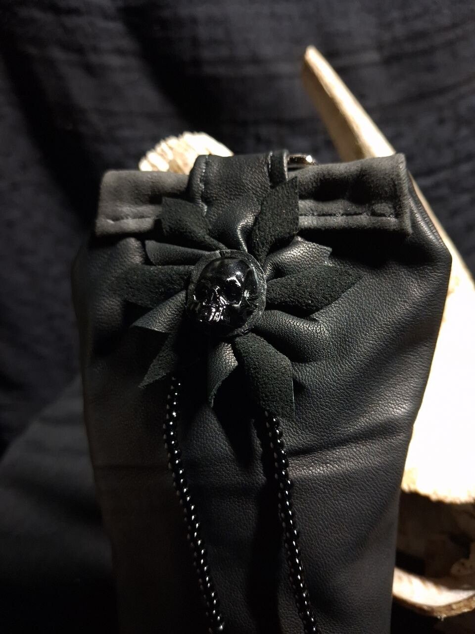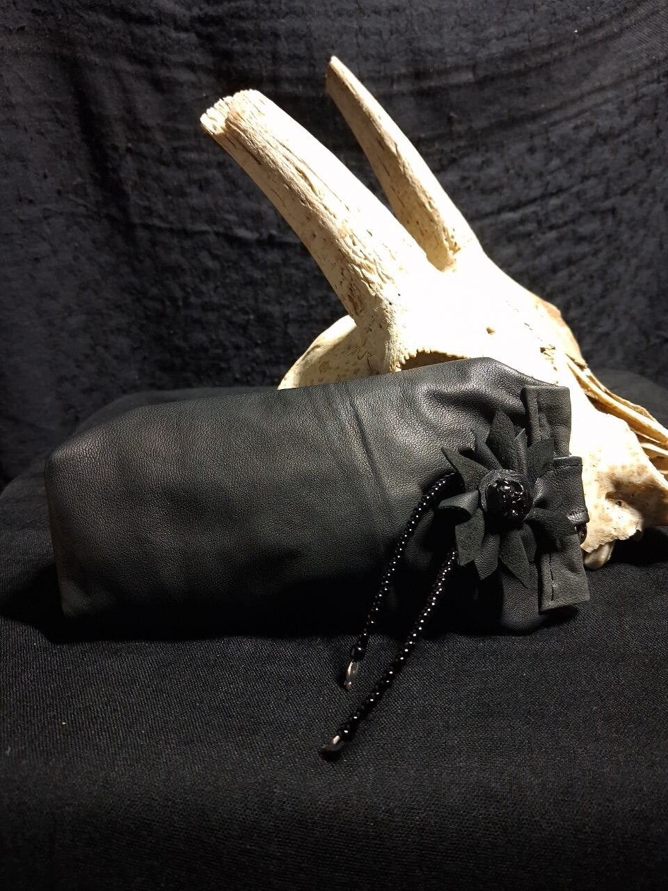 Small bag with a clip hook. It consists of two layers of extra soft leather and is decorated with a skullcap flower. There is a zipper in the center of the back.